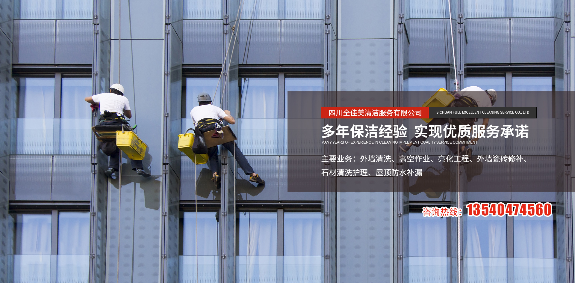 四川全佳美清潔服務有限公司成立于2017年11月20日,注冊資本200萬元人民幣,是一家專業(yè)從事高空外墻清洗,外墻維修,開荒保潔,石材養(yǎng)護,外墻防水等一體化的工程服務公司。公司先后服務于成都鐵路培訓學校,雙流空港酒店,省體育館等寫字樓及工業(yè)園區(qū)的外墻清洗保潔及維修服務。經(jīng)過多年的發(fā)展與努力,公司已具備一定的規(guī)模及實力。現(xiàn)擁有一支技術精湛的服務團隊,以高標準的服務品質,專業(yè)的安全技術實力,為全川不同群體的客戶提供更安全,更周到的清洗服務解決方案,期待與你的合作。